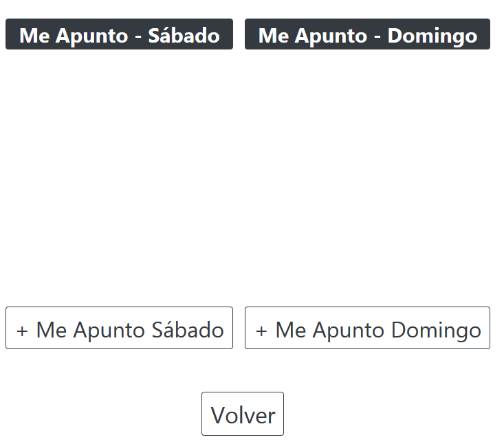El propio color del botón indica si hay alguna pista libre o semilibre o bien si el día está todo completo. En el ejemplo de la imagen se ve el botón “Sábado” en rojo porque todas las pistas están ocupadas. En cambio, el botón “Domingo” aparece en blanco indicando que o hay alguna pista libre (no asignada a ningún grupo ni a ninguna pareja) o hay alguna pista semilibre (está asignada a alguna pareja que está buscando rival de su mismo grupo).