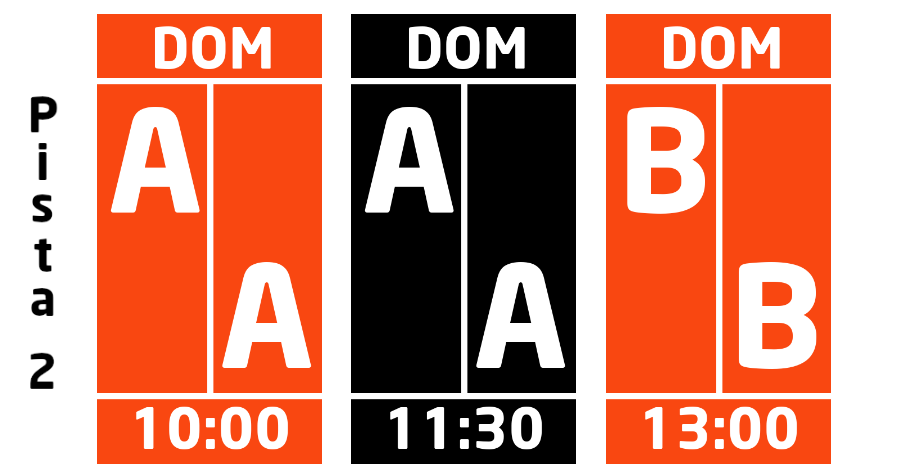 ¿Cómo se intrepreta? La primera fila de imagenes hace referencia al estado de la "Pista 1" en las distintas franjas horarias. La franja de 10:00 a 12:00 está ocupada por un partido del grupo D, la franja de 12:00 a 14:00 por un partido del grupo B y de 16:30 a 18:30 hay un partido del grupo A.