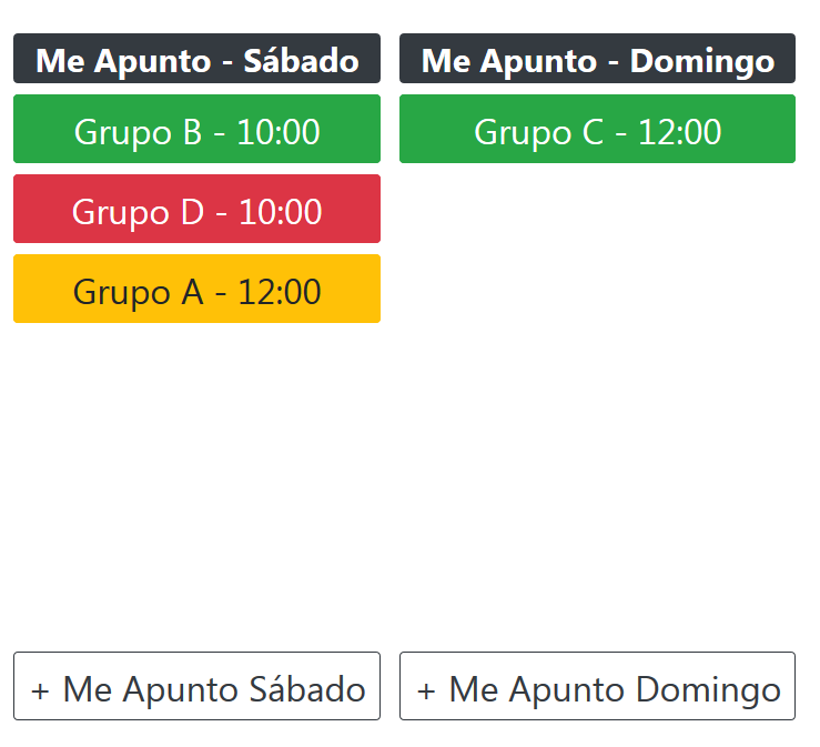 El propio color del botón indica si hay alguna pista libre o semilibre o bien si el día está todo completo. En el ejemplo de la imagen se ve el botón “Sábado” en rojo porque todas las pistas están ocupadas. En cambio, el botón “Domingo” aparece en blanco indicando que o hay alguna pista libre (no asignada a ningún grupo ni a ninguna pareja) o hay alguna pista semilibre (está asignada a alguna pareja que está buscando rival de su mismo grupo).